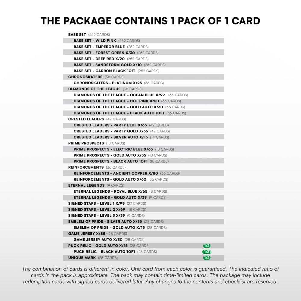 The box includes either a rare Unique Mark card with a piece of a game-used jersey featuring a number, team logo, or a letter from the player’s name, or a card with a piece of a game-used puck and the player’s signature Puck Relic – Gold Auto x/15, or its even rarer version Puck Relic – Black Auto 1of1.