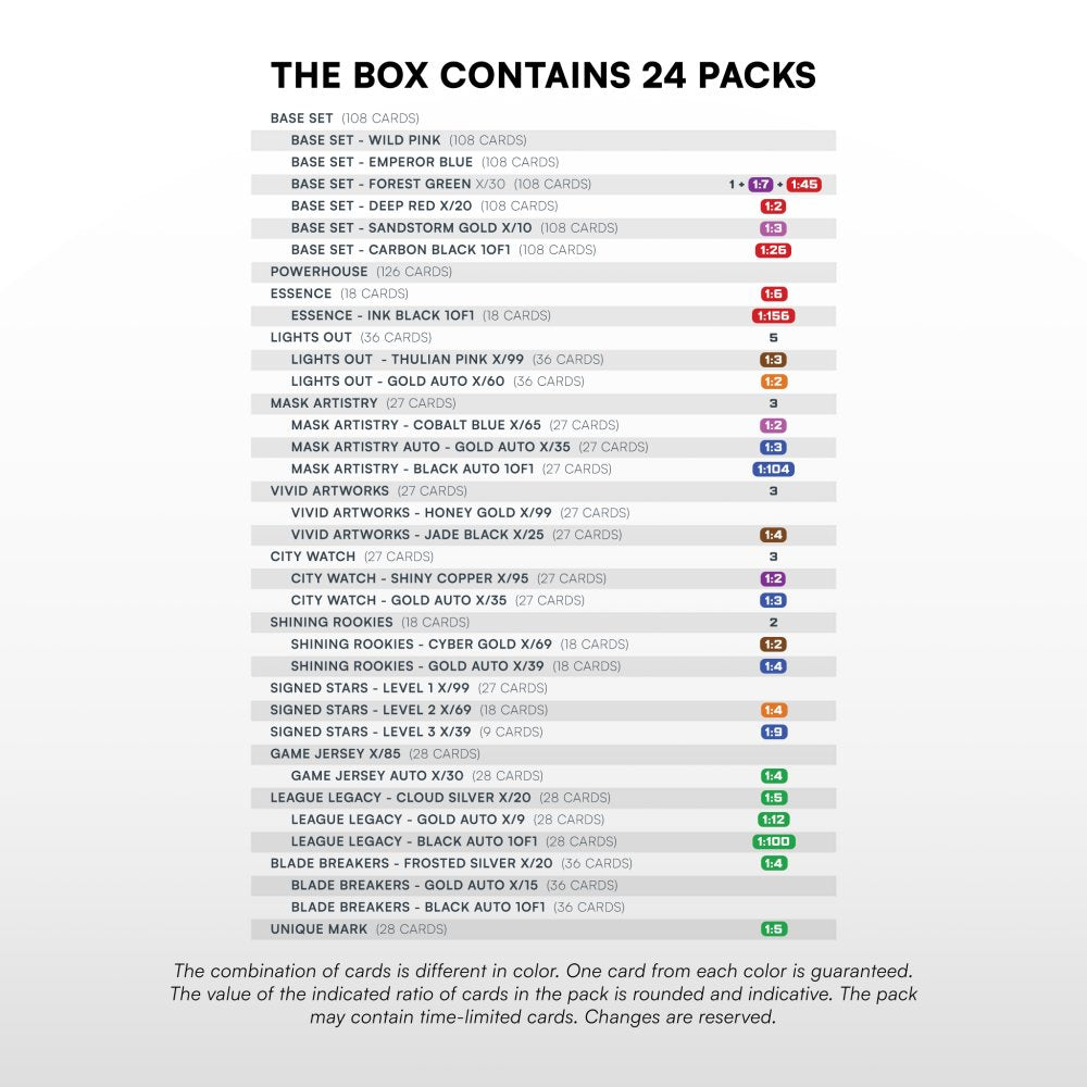 Each Hobby box guarantees: 1x Base set - Forest Green x/30, 5x Lights Out, 3x Mask Artistry, 3x Vivid Artworks, 3x City Watch, 2x Shining Rookies
