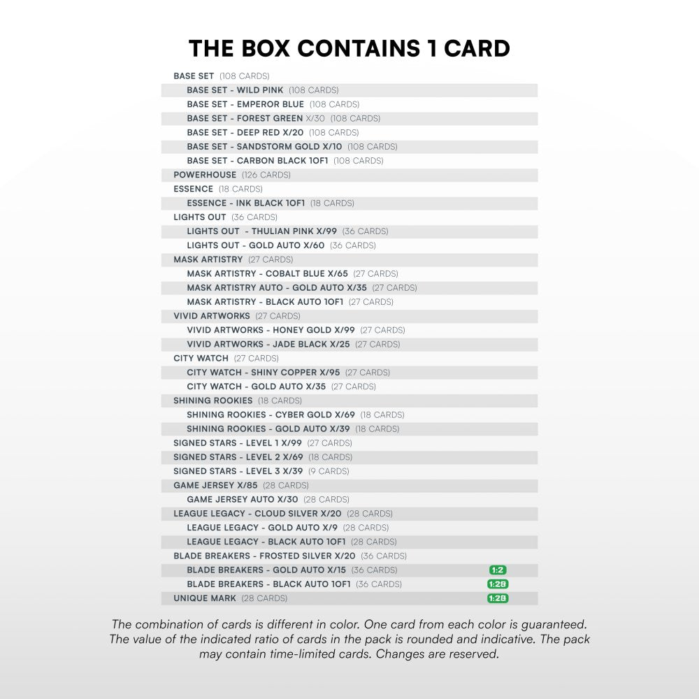 The box includes either a rare Unique Mark card with a piece of a game-used jersey featuring a number, team logo, or a letter from the player’s name, or a signature card with a piece of a game-used hockey stick Blade Breakers - Gold Auto x/15, or its even rarer version Blade Breakers - Black Auto 1of1.